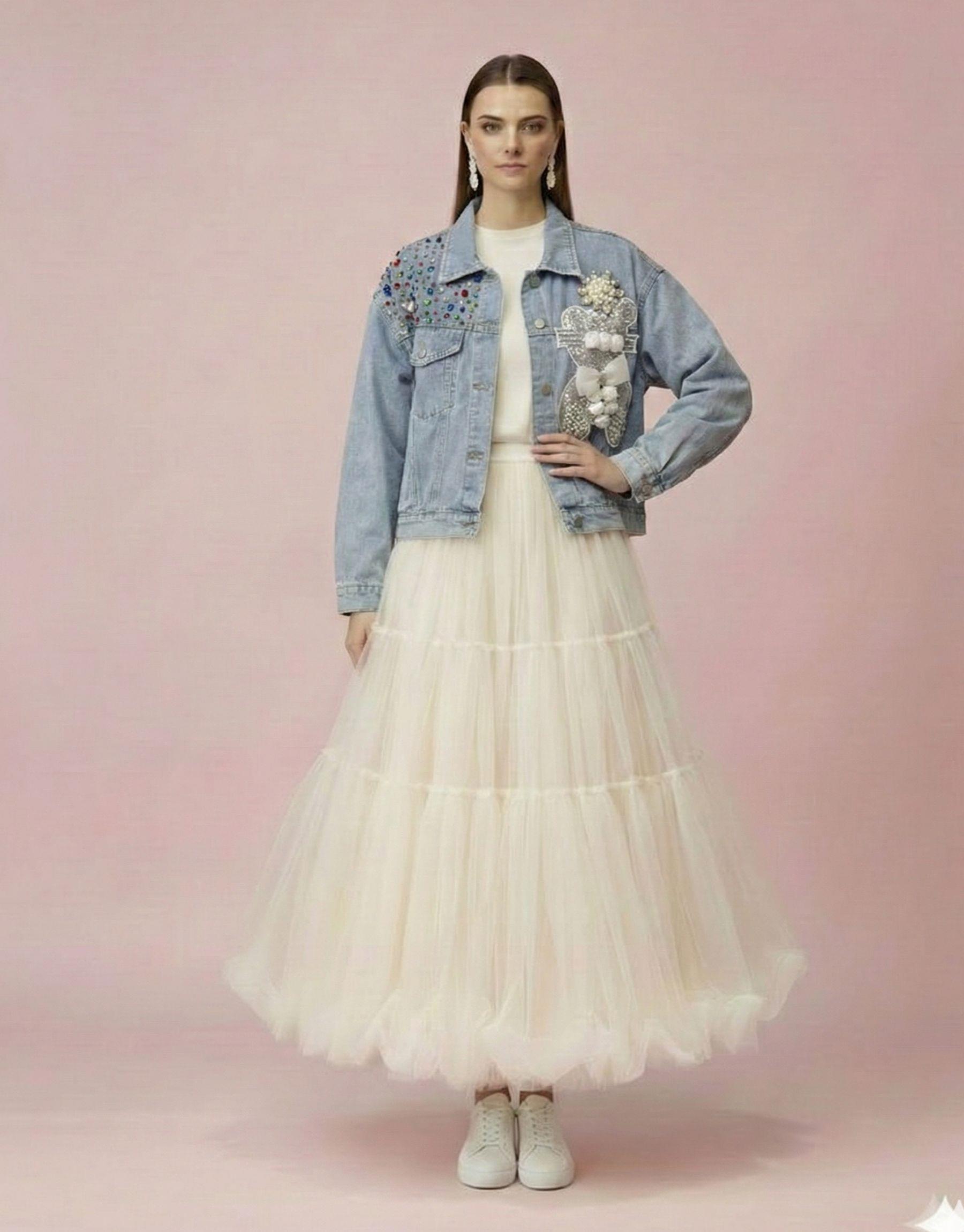 TÜL DETAY KOT CEKET MAVİ