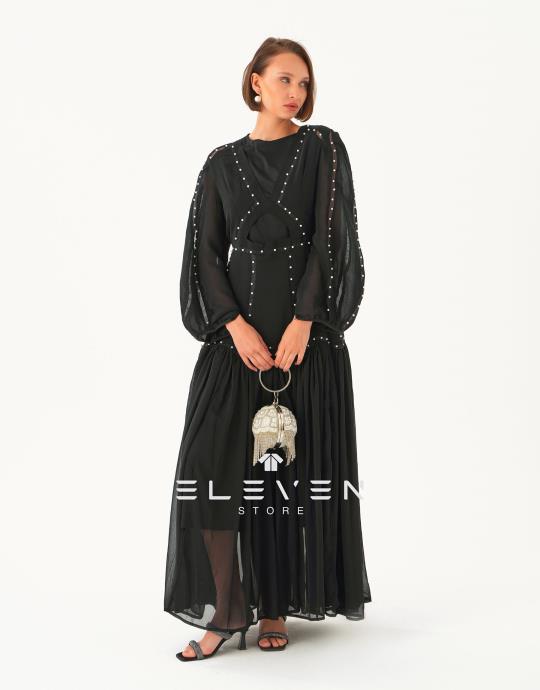 KADIN İNCİLİ TASARIM ELBİSE SİYAH
